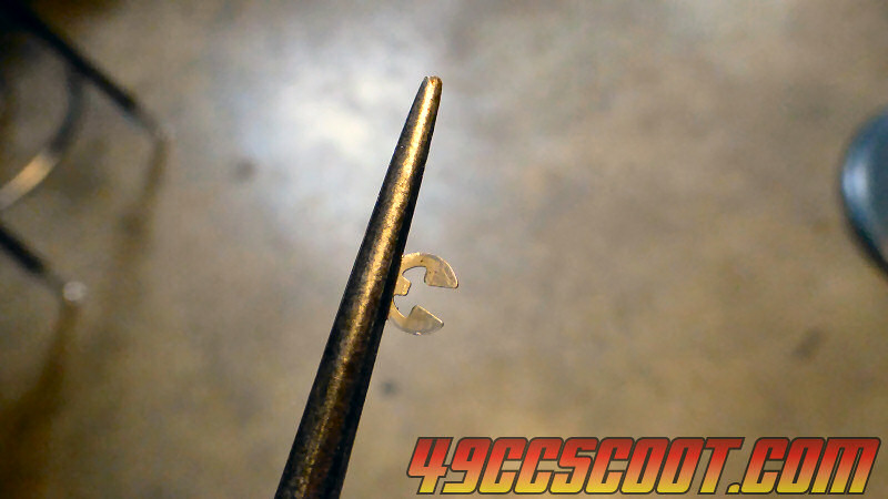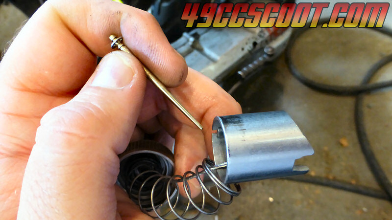 There is a tiny o-ring that usually ends up on the needle below the clip or stuck in the recessed center of the slide. You can leave it wherever it stays, but be certain it's secure and does not get lost while you work on the needle settings. If the o-ring is dry, cracked, or otherwise damaged, replace it. You may even be able to find one that works in a hardware store in a pinch if you don't have a good local scooter shop or don't wish to wait for an internet order.