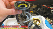 Begin by removing the carburetor's cap. Some models have a screw on/off cap and others have a bolt-on cap with two screws that need to be removed. Pull the slide assembly up and out of the carb. Be careful not to misplace the gasket or o-ring under the cap.