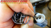 If the spring came off of the carburetor top, reinstall it over the center section. Compress the spring so that the cable sticks out. You may notice me using forceps for the pictures. This is not necessary. I did it because it's difficult to take pictures while doing some of the steps below with one hand occupied holding the spring.