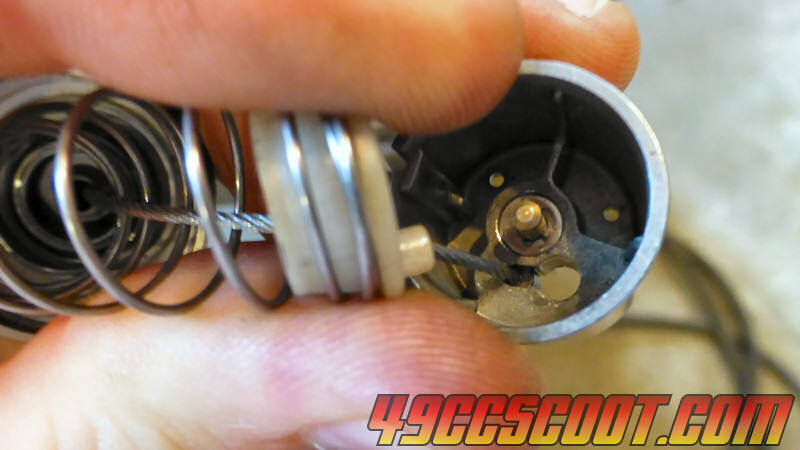 Bunch up the spring a bit and position the throttle cable into the cutout in the side of the needle plate. Then let the spring meet up with the needle plate. Let the spring and plate fall all the way into the slide, making sure the nub on the needle plate aligns with the large hole in the slide.