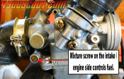 If you cannot get the engine to idle well enough using the idle speed adjustment only, you may need to adjust the mixture screw as well. Scroll down to the more thorough idle setting information. There's no harm in adjusting the mixture screw now even if you don't have to, but it may need to be adjusted again later anyway. Keep the idle adjusted as described as necessary while you move on through the tuning process.